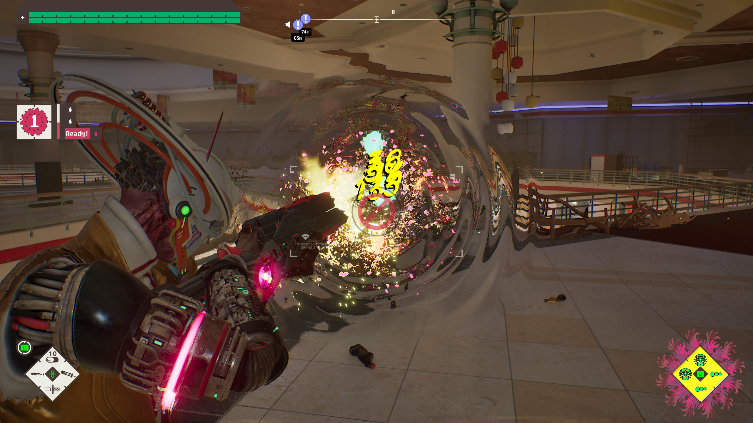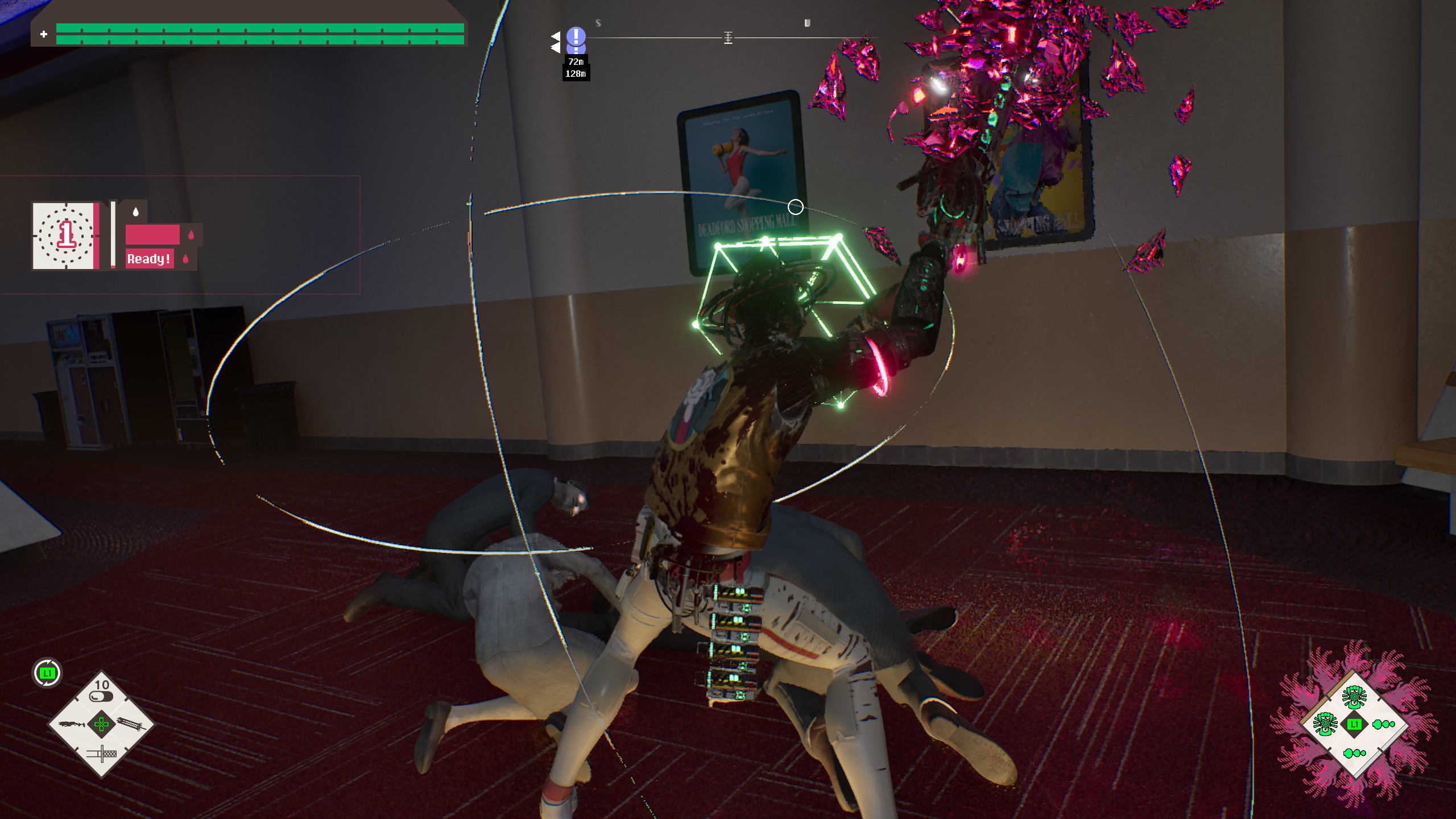 On paper these all seem to build a poor combat system and yet, I like playing Romeo. I like its one combo combat and its messy enemy placement. I like it more than last year’s ultra slick Ninja Gaiden 4 or Ghost of Yotei. I admire its purity. I love how much of it feels stripped wholesale out of No More Heroes 2, Grasshopper Manufacturer’s most underrated title. I like how it cultivates restraint in me as a player even as its go-to obstacle is a Dynasty Warriors level of zombies to tear through. I like the weight of the Star Destroyer, the pop of the Juggernaut, and the slow down that happens when you burst enemies like overripe watermelons. With a few upgrades, I grew to love the awkward process of unloading a machine gun on an enemy waddling down a corridor before smacking it around with a chainsaw sword. I liked it enough to turn off its more unique mechanics for a minor damage boost and still felt satisfied.