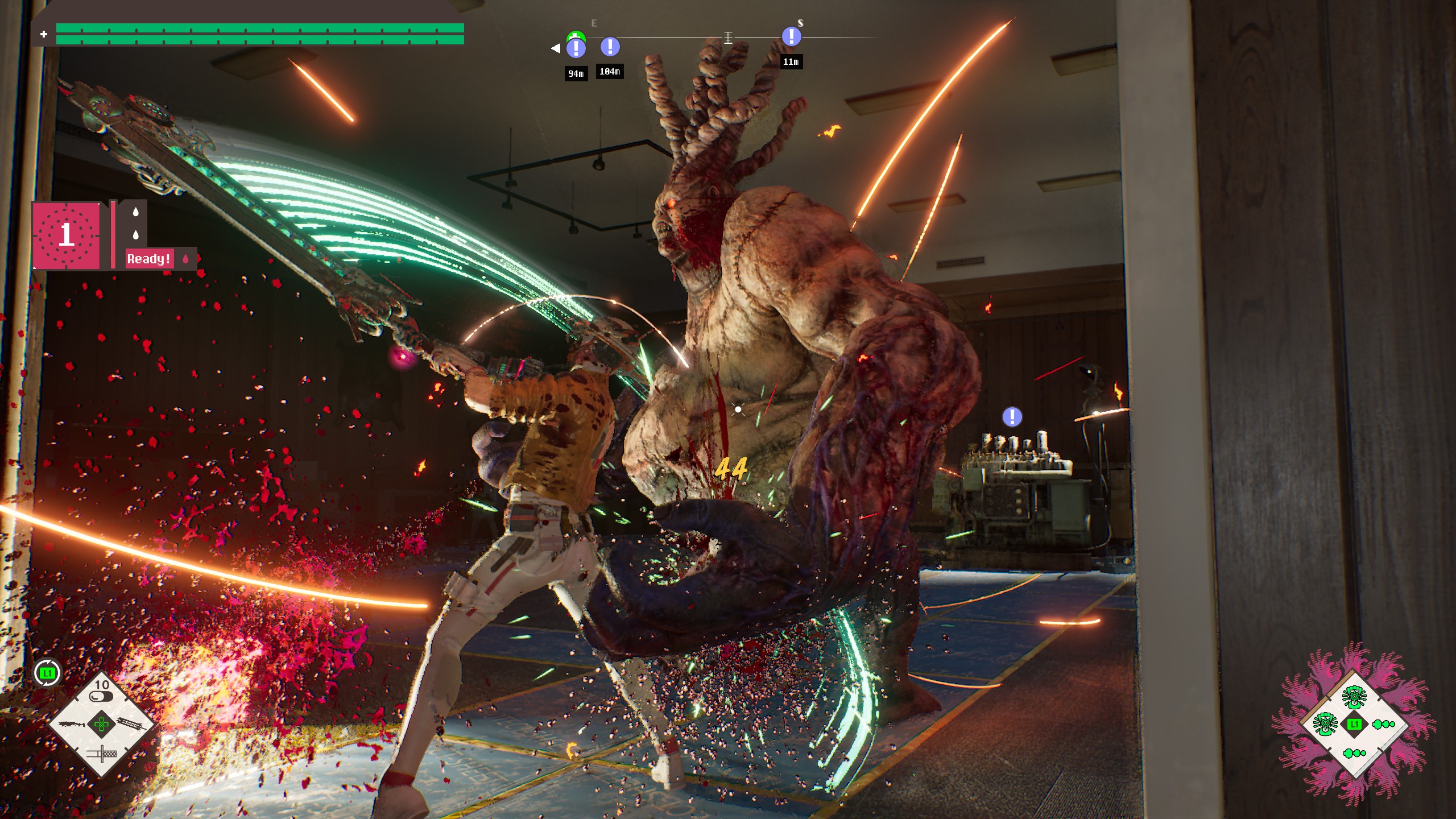 Still that mechanic is worth some spotlight. During the wholesale slaughter of the ‘rotters’ that occupy the levels, players will acquire seeds they can use to cultivate ‘Bastards.’ Bastards can be assigned and used in combat, each having their own cooldown after use. Cultivating bastards involves sending them to battle with each other, and then planting the resultant seed to get a buffed version of one. It’s a simple system, but one that allows players to fill the gaps in their strategy. One of the first drops players get is a sentry gun, giving cover fire as you wade through the crowd of the undead, but I preferred ones that offered bursts to stagger bosses. It’s a system that feels like a solid evolution of the abilities from the studio’s previous release, No More Heroes 3, and one that helps smooth out its lack of combos. Much like its predecessor, artfully doling out Bastards against bosses can feel downright filthy, stunlocking them in loops where they’re helpless to stop you. It’s a satisfying, but not static result, since I found about half the bosses were resistant to my particular build.